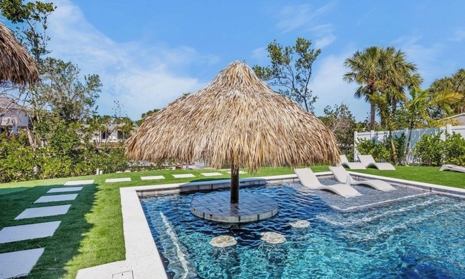 Outside, unwind in your private oasis. The sparkling pool overlooks the serene canal, providing a tranquil spot for sunbathing or a refreshing dip. The hot tub invites you to relax under the stars, while the outdoor kitchen is ready for barbecues and gatherings. The highlight of your outdoor space is the charming tiki hut, complete with swings for lazy afternoons.