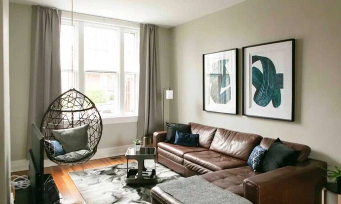 -The living room features a leather sectional, swing chair, and 50" smartTV with wifi.
