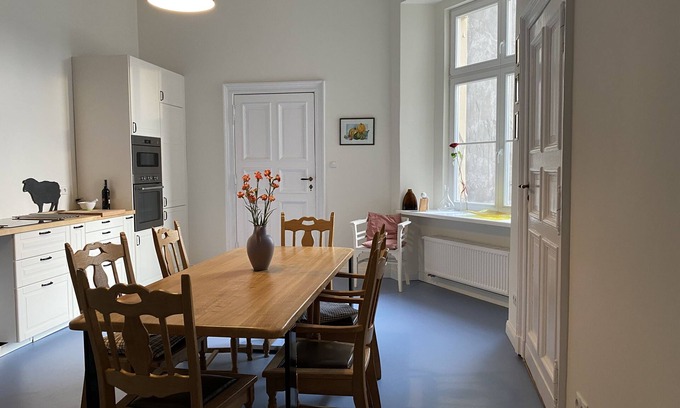 Welcome to our newly renovated Schirdewan apartment. On a total area of 190 m² you have 5 rooms (4 bedrooms, 1 salon), 2 bathrooms (1 bath, 2 showers, 2 toilets), a huge kitchen and an extra guest toilet. During the renovation, we have put a lot of emphasis on the preservation of the original elements (parquet and wooden floors, wooden windows, original entrance door) as well as modern elements (high-quality ecological linoleum floor in the kitchen, rain shower and ceiling shower, state-of-the-art home entertainment)