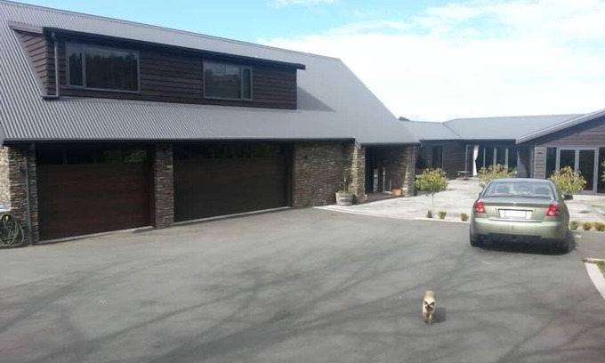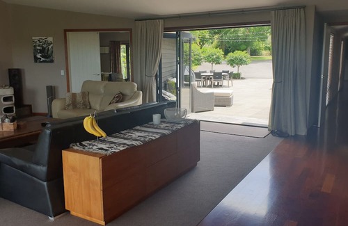 Large family home in peacefull setting over looking the Waikato river, lake and mountains. Watch the tuis and quail from one of 3 decks or play tennis on the astro turf tennis court. 10 minutes walk to town along the river. 2 minutes to mountain bike tracks. Also has astro court.