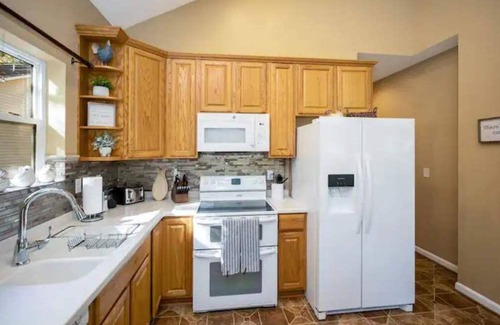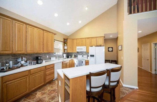The home comfortably sleeps 10, with 5 bedrooms and 3 and half bath. This three-story home is ideal for large gatherings, offering ample space and comfort. Enjoy complimentary coffee and tea in our beautiful kitchen, well-equipped with appliances, granite countertops and ample spacious cabinetry. The dining area can comfortably accommodate a large group, rendering it a suitable venue for family dinner gatherings or entertainment. Complimentary high-speed Wi-Fi is readily available throughout the house. There are smart TVs on all three levels for a peaceful escape.