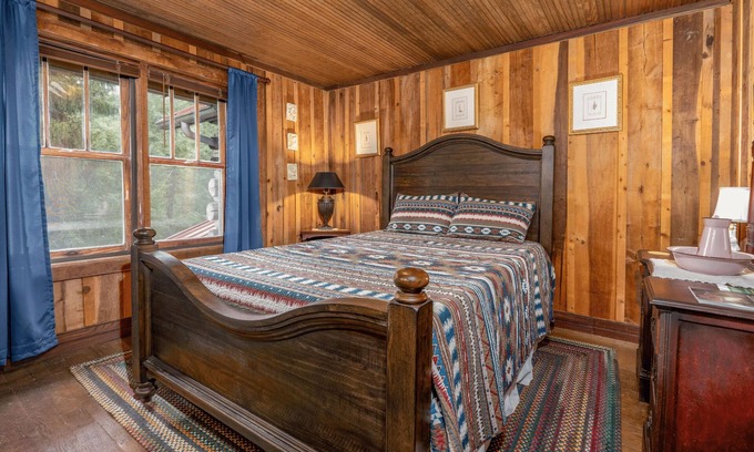 Enjoy serene views of the lodge grounds, trout pond, and surrounding mountains above Little Choga Creek. The Hummingbird Suite blends rustic character with refined comfort, offering a restful escape in the heart of the Nantahala.