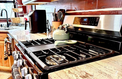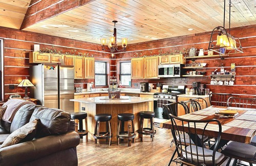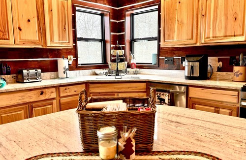 As you enter the cabin with your unique code, ensuring your security, you will be greeted by a spacious floor to ceiling stone fireplace. This open concept area has two recliners and one couch to relax in front of the woodburning fireplace. A beautiful custom made Brazilian Chestnut table seats 10 with additional seating on 4 handcrafted barrel stools around the granite island. Your kitchen is filled with modern amenities like a dishwasher, microwave, air fryer, 4-slice toaster, gas, stove, and refrigerator. It features beautiful granite countertops. The stocked coffee bar is a perfect place to start your day with ground and coffees supplied. You will find plenty of dishware, pots and pans, bakeware, and utensils to ensure you have what you need to cook meals. Feel free to inquire on any specific kitchen questions.