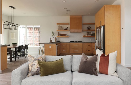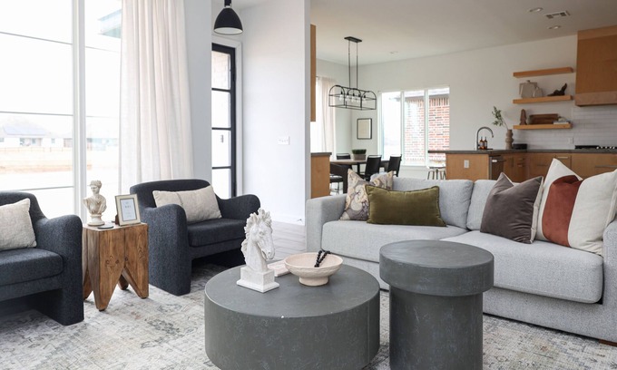 Enjoy pond views, luxurious design, endless natural light and an abundance of amenities in this modern retreat nestled in a safe and family-friendly neighborhood with a park and waking trails in South Tulsa/Bixby. With three bedrooms and three full bathrooms, this spacious and well-appointed home comfortably accommodates families and groups seeking a relaxing escape. A dedicated office space and exercise bike is available to make your stay exceptional.