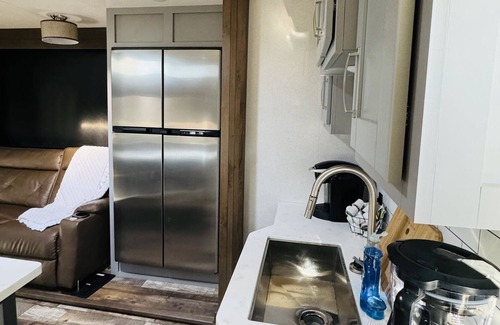 2021 Fuzion 5th Wheel Camper situation snug against the beautiful sand rocks, with an amazing