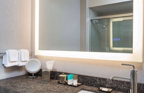 Hyatt Regency Rochester offers 341 accommodations with iPod docking stations and safes. Pillowtop beds feature down comforters. 55-inch flat-screen televisions come with premium cable channels and pay movies. Guests can make use of the in-room refrigerators and coffee/tea makers. Rooms have partially open bathrooms. Bathrooms include showers, slippers, designer toiletries, and complimentary toiletries.