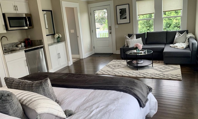 Sleeps 4: 1 King size bed and 1 queen sleeper sofa. Large walk in closet. Kitchenette with microwave, refrigerator, Nespresso coffee maker. Bathroom includes tub and shower. Outdoor courtyard with seating area.