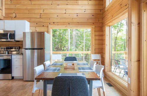 Experience comfort, contentment and joy at Hygge on Seneca. This recently built home is a Pluspuu home as seen in Dwell Magazine. Nestled within a tranquil forest overlooking Seneca Lake, this sustainably built Scandinavian inspired log home will immediately welcome you to a stay of relaxation, privacy and beauty. Stellar west facing views of the lake can be seen from the great room that is an open concept living area combining kitchen, leisure and dining areas clad entirely of glass. Enjoy the memorable sunsets from the wrap around deck or from the comfort of the couch. Adding to the coziness are the comfy couches, ample additional seating, plush rugs, soft cork flooring, sauna room and hot tub.