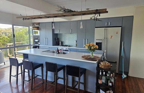 An entertainers delight, modern open plan kitchen with 3 expansive decks to entertain in all weather.
