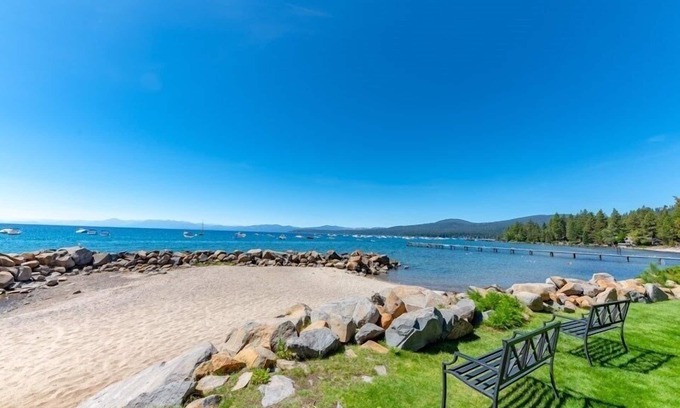 Perfect location for a romantic getaway with a private sandy beach and lakefront lawn only a few steps from the front door. Order dinner in or prepare it yourself in the well equipped kitchen and charmingly decorated dining area OR bring your meal down to the sand for a beautiful sunset picnic. Take a stroll along the beach to nearby Moon Dunes or North Tahoe Beach. Have a romantic ending to your day curled up on the sofa by the fireplace.
