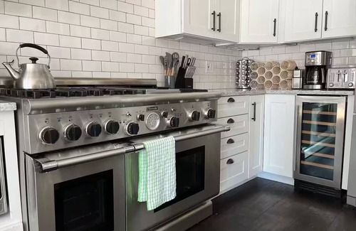 The kitchen is a chef’s dream with a double oven Thermador including grill and griddle and spacious countertops.