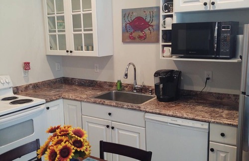 KITCHEN: We supply a fully equipped kitchen which includes crock pot, auto drip coffee pot with coffee provided, Keuriq, blender, toaster, fry pans and sauce pans and a 9x13 baking pan. There is also a large stock pot for cooking up Frogmore stew or your favorite soup. There are plenty of dishes, cups and flatware. There is a microwave and dishwasher. We also have measuring cups and spoons, cutting knives and a pizza pan.