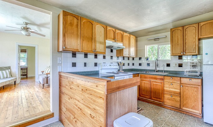 Enter by way of a well-equipped kitchen and a dining space; they lead into a light-filled living room with wall AC and dual sofas. There's one bedroom, one full bathroom, a private washer/dryer for all of your laundry needs, and free WiFi provided throughout the cottage.