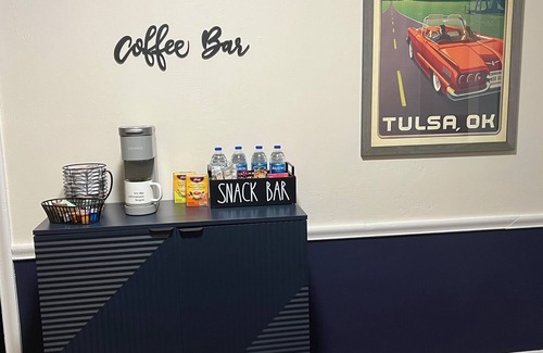 • Office Area has a Desk, Office Chair, and Fast WiFi on one side, a well-stocked Coffee Cart on the other. Caffeine up, get your work done and then go out and enjoy all Tulsa has to offer!