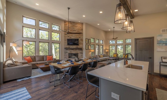 Relax by the stone-wall fireplace in the cozy living room or prepare meals in the fully equipped kitchen with a center island and barstool seating. The formal dining table, perfect for gathering family and friends, flows seamlessly into the sitting nook surrounded by windows—your own private spot to unwind with a good book or a movie. Step outside to the spacious deck to take in the serene surroundings, soak in the hot tub, or enjoy the fire pit under the stars.