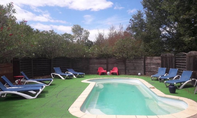 Two bedroom gite with private terrace, large communal garden and swimming pool, nestled between vineyards and a nature reserve, yet only 1 and a half km from the beach. There is one king size double room and a twin room, as well as a shower room and a separate toilet. On the gite's terrace there is a bbq, enabling cooking inside or out in the beautiful Mediterranean climate.