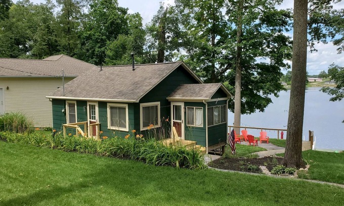Lovely 2-bedroom 1-bathroom cottage on beautiful Papakeechie Lake. Master bedroom has a queen size bed with a view of the water and the second bedroom has 2 bunk beds. A lovely kitchen, living room and dining room, with plenty of views of Papakeechie Lake. There is a fire pit and a nice patio area with a great dock and beach just steps from the cottage door. Papakeechie Lake is a tranquil non-motorboat lake where kayaks, paddle boats, paddle boards and sail boats are the way of life. The fishing also is great. With plenty of crappie, largemouth bass and blue gills to be caught. You can enjoy the peace and quiet of the lake or if you would like to bring a motorboat and launch it at Lake Wawasee, this cottage is just minutes from the public boat launch. The cottage is just across the road from Tri-County Fish & Wildlife Area, where there are more ponds for fishing and hunting happening. It can also be a great place to sightsee and bird watch. With so much to do or not to do you can't go wrong with staying at what we like to call the Harvest Moon.