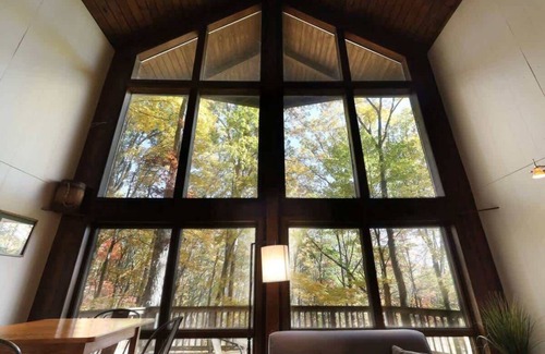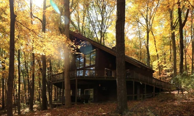 Idyllife is situated on the mountainside only 4 miles from downtown Berkeley Springs. The cabin features three levels, four bedrooms, and three bathrooms.