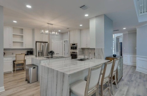 Indulge yourself by booking a stay at our tranquil home in Rowlett. Situated on a large lot, this home provides a HUGE space and is equally stunning both inside and out. The 5 bedrooms, 4 baths, large kitchen, and fabulous living room all contain beautiful décor and sumptuous furniture. Tons of space, a touch of luxury, all the essential amenities, and the icing on the cake — a sprawling backyard with a pool! 4 minutes WALK from Lake Ray Hubbard!