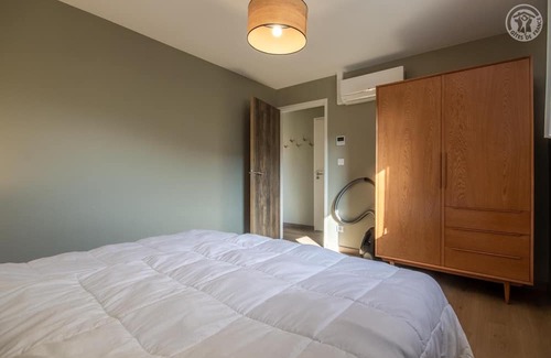 Individual wooden chalet on stilts on the edge of the municipal campsite of Chanaz. Access by an openwork metal staircase. 1st floor: living room-kitchen with access to the balcony-terrace on stilts, 3 bedrooms (2 single beds 90x200 cm/2 single beds 90x200 cm/2 single beds 90x200 cm), bathroom water (shower), WC. Air conditioning payable at a fixed price. 5 km from Place de Conjux, at the very end of Lac du Bourget, this unusual lakeside marina rises on the edge of the port to offer you a peaceful and unexpected vacation spot in Savoie. The chalet, furnished in a contemporary spirit, allows you to enjoy an exceptional environment. Discover Chautagne, a preserved wine region between nature, gentle countryside and lakeside activities 24 km from Aix-les-Bains.