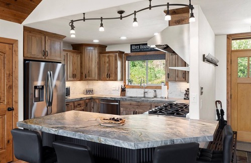 Huge custom outdoor playground while enjoying the views of the river and the wildlife. Including: Gazebo with dining area, BBQ island; 44” 6-burners, infra-red side/rear & rotisserie burners, sink, pizza oven and beverage refrigerator. 3-motor 100 jet Jacuzzi. WATER IS CLEANED & REFILLED WITH FRESH WATER BEFORE EACH GUEST is now in place.
