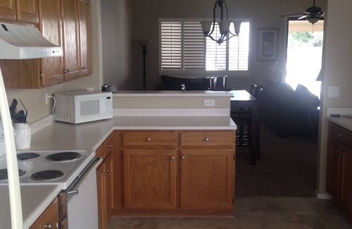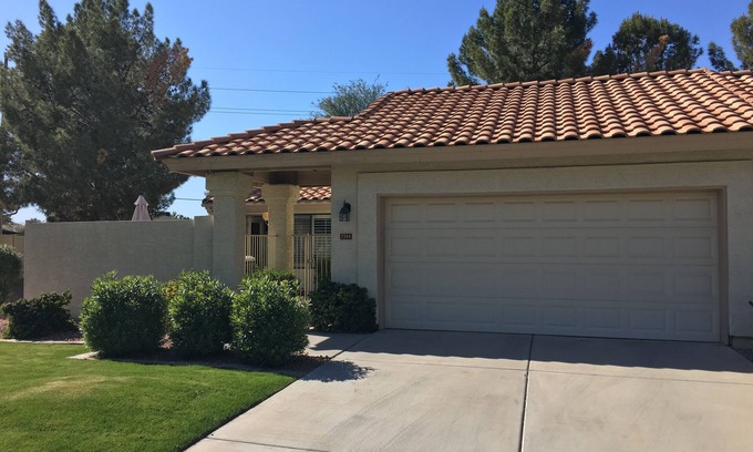Well kept, clean, recently remodeled, fully furnished, 2 bedroom condo, with a 2 car garage. Garage floor has recently been epoxy coated. Located in South Tempe, away from the ASU corridor. Close to South Mountain, canals, Ken MacDonald Golf Course, Kiwanis Park (tennis, volleyball, and a large lake) and plenty of restaurants. Perfect for quiet getaways. Also has a barbecue, patio table/chairs for 6, wireless Internet, cable TV, and iPod docking station. The common areas include a heated swimming pool and jacuzzi; open all year around.