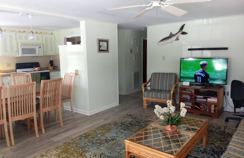First floor unit has three bedrooms (queen bed, one full, three twin beds), one full bath, heat, central air, private full-sized washer/dryer and modern outdoor shower. It's our home, too, so we've set it up with everything needed for a great time in the sun.