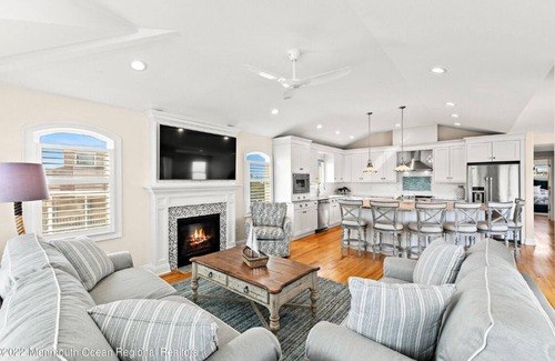 Main interiors of the elegant coastal-themed home are bathed in light and showcase ocean views. The gracious open-concept top-floor features a living room with fireplace, large dining area, and chef’s kitchen with extra seating around the generous island. A middle-floor family room with terrace, sun-filled bedrooms including a junior en-suite, beautifully-designed baths and a laundry room make it irresistible! Just 5 homes from the beach, walk to Black Eyed Susan, Birdie's, Neptune Market, Harvey Cedars Shellfish Company, Sunset Pizza, coffee & ice cream shops, and close to tennis, pickleball, yacht clubs and other attractions.