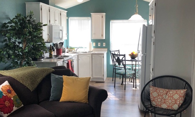 Stay in a tastefully decorated park model in one of Tucson's top resorts - Voyager Resort. The park model is approximately 600 square feet and includes a modern kitchen, dining area, family room, 1 bedroom with queen bed, a full b