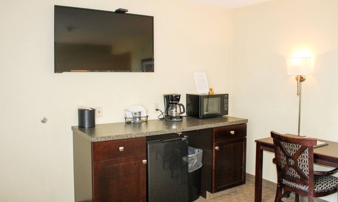 The Glacier Suite 114 is a first floor suite. It is divided by the bathroom into a living room and sleeping area. The sleeping area is furnished with a king size bed and the living area has a full sleep sofa for that extra guest or the kids. The suite is equipped with all the amenities for an extended stay including a small refrigerator and microwave.