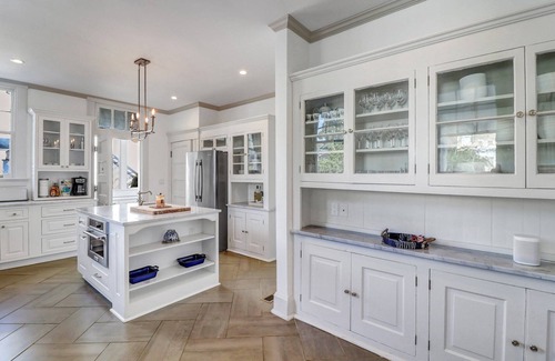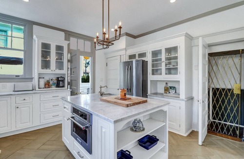 You’ll find the home’s four bedrooms spread out amongst 5,200 square feet, and three stories. The main bedroom has a king-size bed, ample closets and a full en suite bathroom. Off of the main bedroom, a quaint room includes a twin bed, perfect for young children. The second bedroom has additionally features a king-size bed, and a luxurious ensuite bathroom. A large, third bedroom features two twin beds. Moving over to the fourth bedroom, a Queen size bed is offered with plenty of storage. On the third floor, considered the loft, the space boasts with light, vaulted ceilings, and original windows, where another two private bedrooms can be found, each with full-size beds.