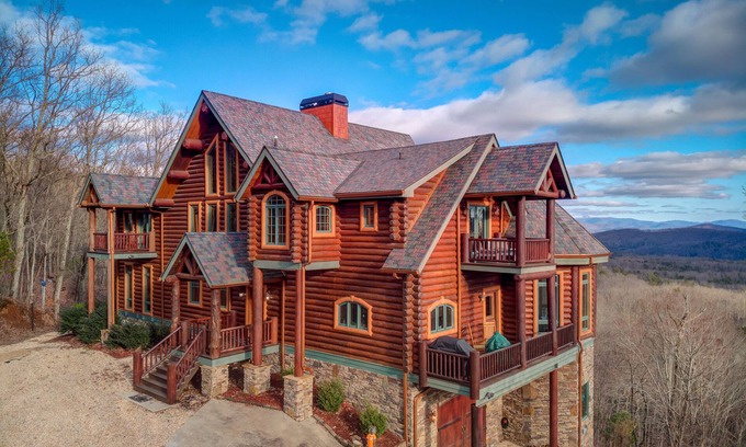 Gaze upon sweeping views of the mountains and valley from this incredible log cabin (yes, it's made in the Lincoln log style!). The views from the enormous 30-foot windows in the living room provide views of Brasstown Bald mountain and three different states. Multiple decks, including one with an outdoor living room, provide space for everyone to relax and be together. The private gas grill is sure to provide fun and delicious entrees cooked outside. Indoors, central air conditioning will help keep everyone comfortable during your entire stay. The home's movie theater is well equipped for movie marathons. Just remember to make up some snacks inside the fully equipped kitchen that includes a wet bar, granite countertops, and a kitchen table that was used in two scenes of the movie “Insurgent.” The entire home is full of treasures like this, including a reclaimed Georgia gold mining cart in the living room, mounted on railroad tracks from Charlotte and set on Georgia barn beams. The wooden eagle in the same room is from Mexico, while the antique canoe and other taxidermy were from sources throughout the Southeast. Can you find the cutout of the Duke? He's hanging out near a prime work station within the home, suitable for remote work or schooling. Two wood burning fireplaces and two gas fireplaces add a warm atmosphere, and the firepit is lit with logs from the original construction of the home. Take some time to enjoy the fresh air inside the private hot tub. There's room for everyone at this luxurious home.