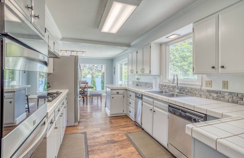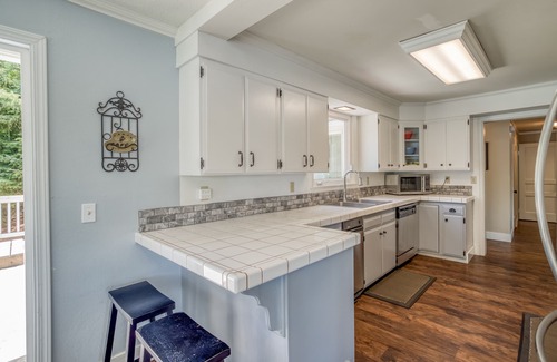 Built in 1930, this impressive lake front home was beautifully updated in 2015. This will become your go-to home for family reunions and awesome fun with friends after you’ve stayed in this lovely retreat with views and direct access to sparkling Devils Lake. You’re just ten minutes to the beach, but you may think about staying put, given that you have your own private dock, kayaks, hot tub, patio, fire pit, and lawn at this lakefront beauty. There’s plenty of entertainment indoors as well, including seven flat-screen TVs, a media room, bonus room and second kitchen downstairs. Hardwood floors, beautiful finishes and modern sofas will delight your guests. And don’t worry about including additional family and friends—the home has two water heaters, a commercial wi-fi hub, two kitchens and three large gathering spaces indoors. Adults will enjoy the three queen bedrooms and the kids will be delighted with the bunk room with big-screen TV and another upstairs bedroom with four cleverly boxed-in and curtained twin beds with their own plug-ins for electronic devices. The 5,500-square-foot home is situated on nearly an acre, so you'll enjoy space, privacy and all the natural beauty of the lake from the hot tub patio and a sweet deck complete with porch swing. It also offers 4 additional memory foam sleeping pads for your convenience! Change up your coastal stay with time on the lake and get the best of both worlds for your family and friends!