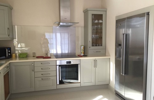 Large fully fitted kitchen to very Hi Specification. Corian work tops. Large American fridge with Ice Maker. Dish washer. Electric oven and hob. Microwave, coffee caffetierre, Kettle, Toaster, Sandwich maker, Breville. All the cutlery and crockery you could need.
