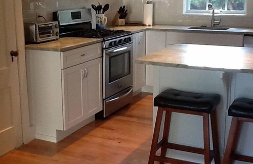 Our historic home is situated right on Main St in the heart of Castine. The home is across the street from the Castine Golf Course and two blocks to the shops. There is a large 1/2 acre yard off the back of the house perfect for kids to play and a large deck overlooking the yard and garden to enjoy the sun. The House had a major renovation in the summer of 2013 with a brand new updated kitchen, heating, windows, wiring, and paint. Our home has all the necessary amenities of a modern home (wifi, flat panel tv's, lighting) with the historic molding and charm of Castine. We have 4 bedrooms on the second floor with two more bedrooms on the third floor. Then an addition that houses a separate bedroom and bathroom area just off the main house for a total of 5 bedrooms. Great house for a large family or for multi-family stay in the heart of Castine, walking distance to everything.