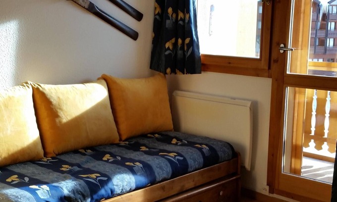 Studio labeled 2 stars, facing south, of 25m2, recently endowed with double windows, renovated in summer 2014, well appointed, ideally located in the heart of the resort, on the 5th floor of the residence 'Le Zénith', a small building on the snow front, in the Place de Caron.