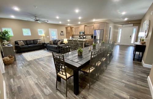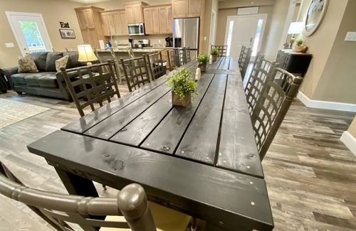 NO steps to enter this home! 8 spacious master bedrooms, with solid core doors, flat screen tv, & granite double sinks. Full granite kitchen with almost every implement you need to make a great meal, including double oven, glass top stove, pots, pans, dishes, microwave, side-by-side refrigerator, dual dishwashers, and propane BBQ grill on the side porch. Large custom-built dining table seats 14 & the bar seats 6 for a total of 20 people. Large open living rooms on each level with 75’ smart HD TV’s. Pool table, comfy seating, wet bar w/ extra refrigerator, & game table in lower living area. Relax outside in your 7-person private hot tub, or lighted seating around your propane fire pit! High-capacity washer & dryer on each level. EV 220 Charging Outlet on front of the house. 4450 square foot house sleeps a max of 20 people. Our homes haves hundreds of FIVE STAR reviews!