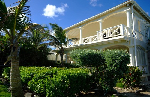 Sunset downstairs as its name suggests, “House Sunset” is located on the western side of the Inchcape Seaside Villas estate, in the very ocean front, where it is the ideal vantage point from which to enjoy the ever-changing tableau of a colorful Caribbean sunset. This ground floor apartment has a large covered terrace, complete with chairs, coffee table, lounge chairs and hammock. It overlooks a magnificent vista of white sand beach and the turquoise water of the Caribbean Sea. It is charmingly decorated and its two bedrooms, each with bathroom en suite, large living room and spacious kitchen, provide a comfortable vacation home. Sunset downstair’s good size kitchen is fully equipped with a four burner stove, oven, good size fridge and everything else a well equipped kitchen should be equipped with. From here you can easily access the dining area which is part of Sunset’s living room, which comes with a mix of elegant and antique furniture, tv and stereo system. Three huge glass windows allow spectacular views at the below Silver sands Beach. From the kitchen it is only a few steps into the dining area which is part of Sunset’s vey spacious living room, which comes with cosy and Caribbean style furniture, tv and stereo system. The downstairs unit of house Sunset can be considered to be a very efficient mix of being situated in a wonderful location, ocean and beach front, spacious, perfectly equipped, simply said a home away from home in sunny Barbados,