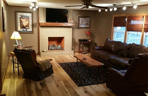 The living room is fitted with a huge leather couch, 1 recliner, and one hand made rocking chair. There are gas logs for your enjoyment in the winter time. Atop the walnut mantel is a 50''Samsung LED tv with a Roku streaming device. Please note the tv is only set up for streaming.