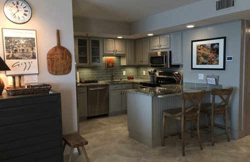 RENOVATED GOURMET KITCHEN WITH GRANITE COUNTERTOPS is equipped to accommodate any gourmet chef. Stainless steel appliances with new induction cooktop and convection oven, warming drawer top of the line cookware, Cuisinart food processor, blender, coffee grinder, Mr. Coffee pot, Keurig, utensils, gadgets, spices. You will feel as if you are at home in this comfortable warm, candlelit, charming condo.