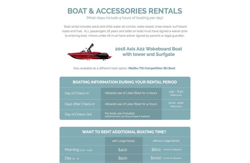 The cost of the boat rental includes the boat, all the skis, wakeboards, surf boards, tubes and life jackets. Boat gas is included.