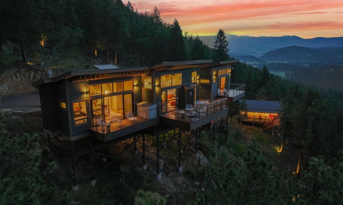 Venture to the vibrant forests of colorful Colorado when you book this luxury treehouse + glamping tent that sleeps up to eight in Bailey. Perched on the side of a mountain overlooking Deer Creek Valley, this home provides incredible views both inside through the floor-to-ceiling windows and outside on the three huge decks. Whether you're visiting for a quiet weekend in the woods or a family ski trip to the nearby Breckenridge resort, this mountain cabin is sure to be the perfect home base!