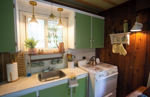 This off grid cottage features a full kitchen with a propane fridge for your meal planning and a full sized stove and oven. Razorback Mountain stuns in the distance while you enjoy the deck at this semi-private. Keep your eyes open for our resident Bald Eagles, yellow bellied sapsuckers and pileated woodpeckers.