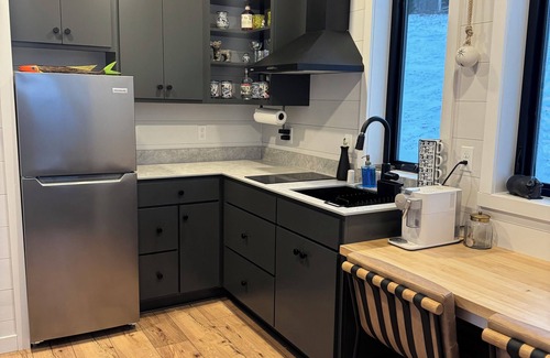 The brand-new kitchen features an induction stove and all the essentials for cooking up a delicious meal. Relax on the premium leather couch while streaming your favorite shows on Netflix with high-speed internet.