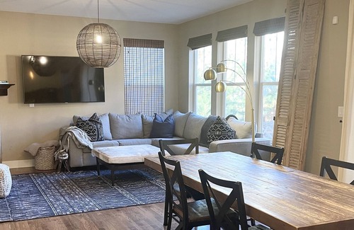 As you enter the home, you’ll enter the living room with lots of cozy seating, a warm fireplace with soft blankets for those snowy nights, and a huge flat screen tv to view all of the latest episodes of your favorites.
