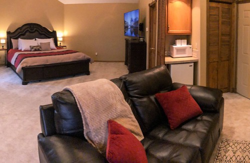 The Branson Expedition Suite is a private space including its own deck and private entrance. Themed with rich reds and golds, this suite is "fit for a king". Has a loveseat in front of the fireplace, a Jacuzzi tub, a private entrance, soft robes, 14 foot ceilings, a massive bed, and a beautiful view that overlooks the Ozark mountain range. Comes equipped with 4K TV, satellite programming, and high-speed internet.