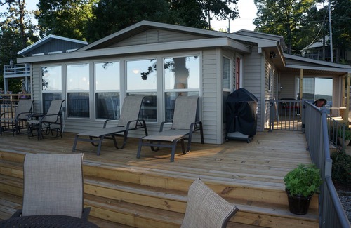 The home features 3 bedrooms and 1 bath. Bedroom one has a king bed, bedroom two has 2 queen beds, and bedroom three features a custom built bunk bed with an extra long twin on top and a full size mattress on bottom. The home also features a full length sunroom with full views of the lake. The new expanded two-tier deck features a large oak tree towering through the middle of the deck and providing a canopy of shade during the day, and lighting hung from the tree at night. We have also included an antique viewer purchased from a resort in Banff, Canada. Looking through this viewer you can see full detail across the lake into Land Between the Lakes or any boats on the water.