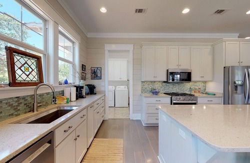 Large open concept kitchen, dining & living room. Highest quality construction with beautiful rooms and art work. 4 BR, 4 1/2 Bath, all spectacular. Each BR has own private Bathroom. Huge, peaceful screened back porch leading to pool. Large 4K TV over fireplace. Walking distance to Pier/Village. Sleeps up to 8 comfortably. Property designed exclusively for the vacation renter. Includes plenty of parking, pool and located in well established, quiet neighborhood.