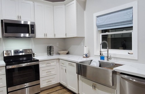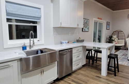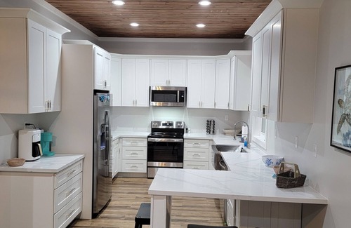 The covered back porch is perfect for sitting and watching boats come and go in White Sound. Our private pool is perfect for cooling off and soaking up the sunshine. With an open floor plan, you're able to cook, entertain, and enjoy everyone's company the entire time. We have all brand new stainless steel appliances, a full kitchen with beautiful porcelain countertops, a large deep sink, and packed with dishes, utensils, pots, pans, and everything we could think of one might need if preparing a meal there. The house is cooled with 4 mini-splits that can be adjusted to individual preferences per bedroom. The washer and dryer are located in the main part of the house for easy access for laundering. We offer a 70" flat screen TV in the living room and TVs in 2 of the bedrooms. We have Starlink for internet. At full capacity, it works great. All the teens/kids/and adults were satisfied with the internet speed. A whole house generator is located on the property to offset any power outages. The house is located in White Sound just around the corner from the Bluff House. It comes with a private dock slip with water and 30/50 amp power just down the hill from the house. The slip has been dredged to accommodate a 4' draft at low tide.