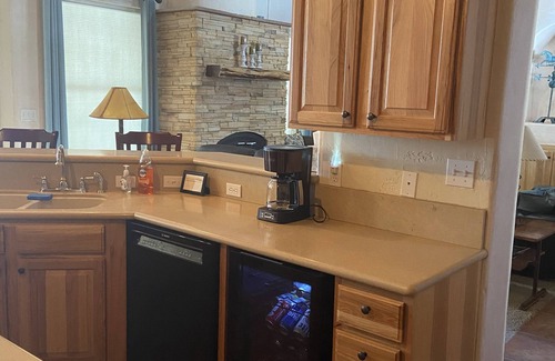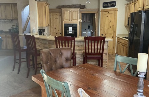 This mountain home sleeps 12 and is close to everything Angel Fire offers! Situated 2 minutes from the grocery store and 5 minutes from the slopes, the location is perfect! We purchased this home in October 2018 and have furnished it completely with new furnishings and appliances, and custom touches throughout the home. There are 4 bedrooms and a bonus room with a smart tv. The living room boasts a 55" smart tv and sound bar, leather couch, love seat and recliner, and wood burning fireplace for relaxing after fun on the slopes or a day on the PGA Golf Course. The master bedroom has a king sized bed, smart tv with sound bar, and a private bath with tub and separate shower. The custom built dining room table seats 10, and there is additional seating for 7 at the bar and custom built buffet. The garage is equipped with a basketball hoop, ping pong table and custom shuffleboard for an added bonus, and is sure to bring out the competitor in everyone! Fiber optic Wifi is included! Enjoy grilling on the back deck, the beautiful pine trees in the back of the house, and walk the trails down to the greenbelt below. Sit back and relax in the Adirondack chairs and light a fire in the firepit while enjoying the tall pine trees and incredible Angel Fire atmosphere that this deck offers. This is the perfect mountain getaway with year round activities and all the comforts of home!